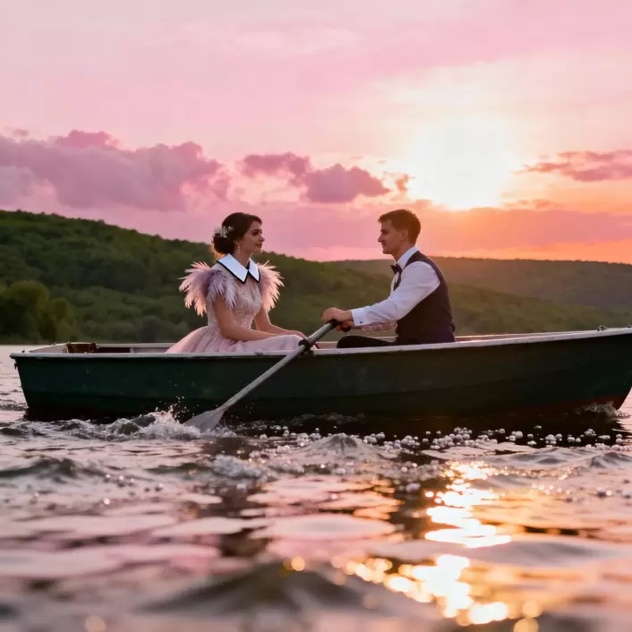 Прогуливаясь по городским паркам в тёплое время года, молодожены могут разнообразить фотосъёмку несколькими кадрами в лодке.
