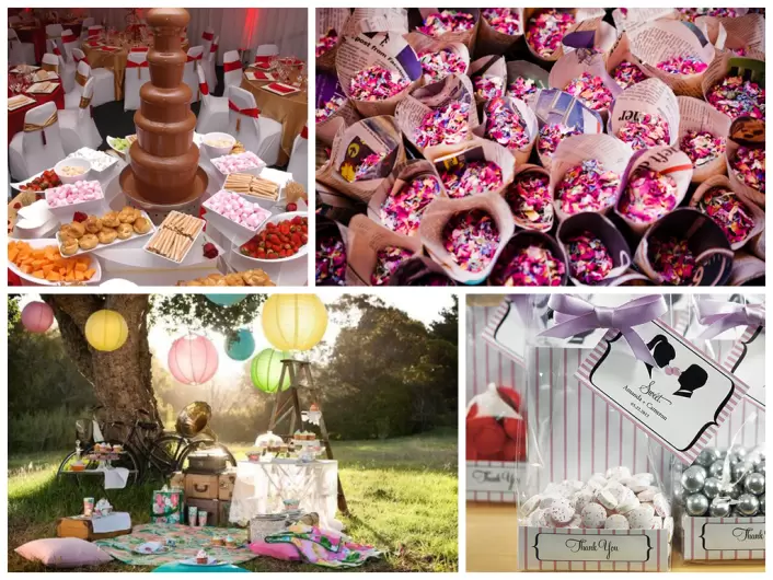 - Сделайте отдельный стол со сладостями, на котором будет стоять шоколадный фонтан, корзинка с разными конфетами или даже фигурки, сделанные из шоколада.