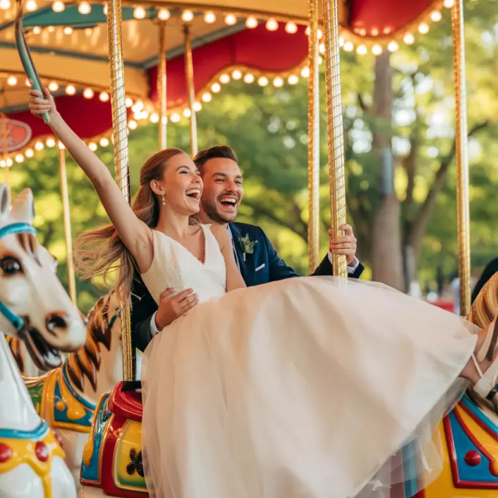 В окружении ярких аттракционов молодожены могут воплотить все самые веселые и смелые идеи. Кроме необычной красочной фотосессии вы прекрасно проведёте время, окунувшись в атмосферу детского праздника.