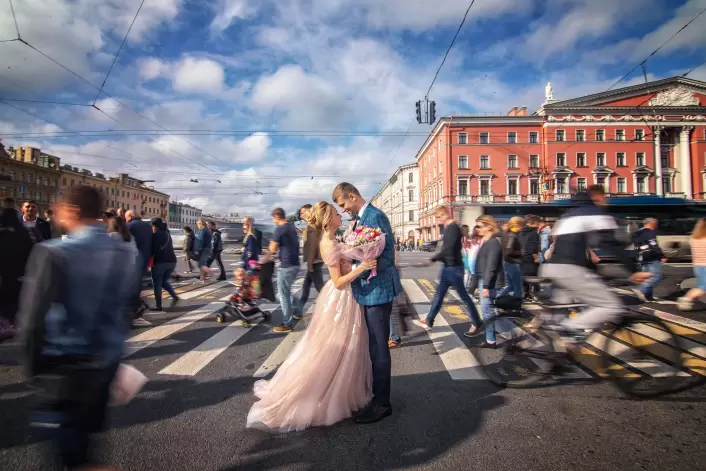 Даже с небольшой высоты красота города открывается с совершенно новой стороны. Для того чтобы осуществить такую идею свадебной фотосъёмки, достаточно выбрать подходящую смотровую площадку с красивой панорамой, а все остальное сделает свадебный фотограф.